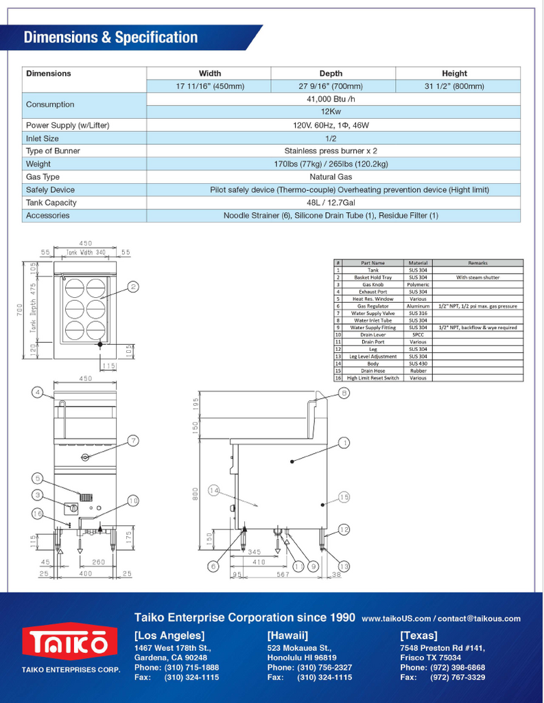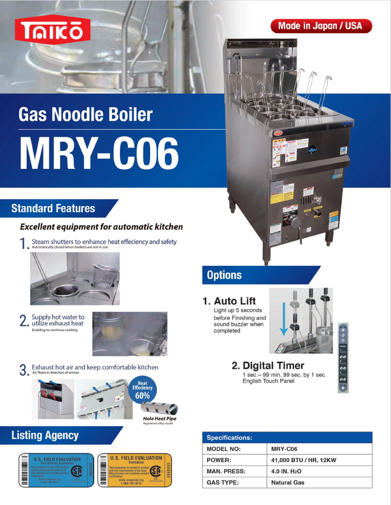 ○Water amount of tank for MRY-C06 is 48 Liters.  The rise time (ready to boil noodle) is around 22 minutes after saving water in the tank and turn on knob.  The cooking capacity is 100 meals / hour.  <In case raw RAMEN is boiled for 3 minutes, the RAMEN amount in one basket is 120g and you spend around 30...
