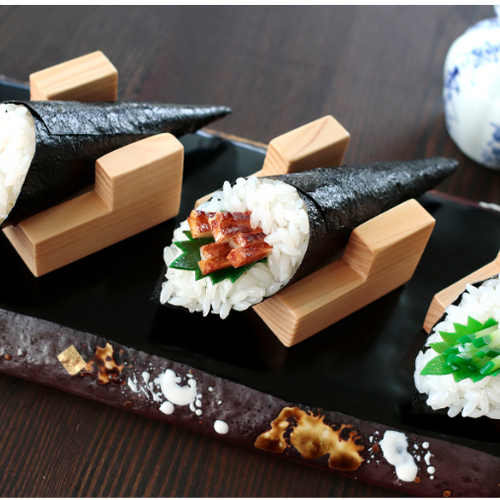 Present your hand roll sushi (temaki) in style with this elegant wooden stand. Designed for professional restaurant use, it's also perfect for home gatherings and sushi nights. Simply place seaweed, rice, and fillings, then serve up to three hand rolls at once. Great for family dinners, parties, or entertaining guests. Features Holds 3 sushi hand rolls Used in real restaurants...